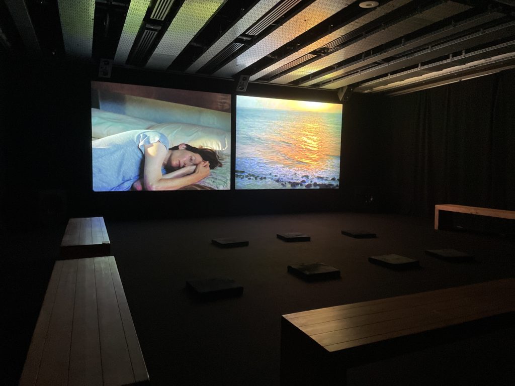 壁や床には最小限の照明が施され、映像の光や作品そのものが空間を彩っていました。展示室全体が静謐な雰囲気をまとい、来場者の多くも自然と声を潜めて作品に集中していました。
