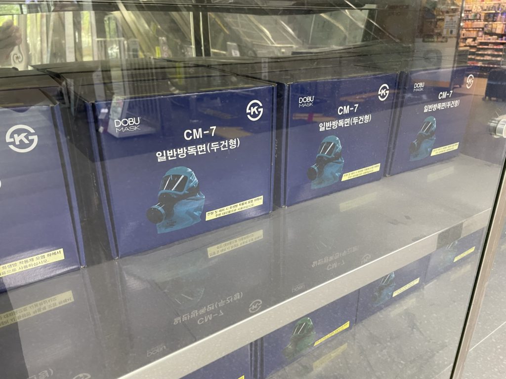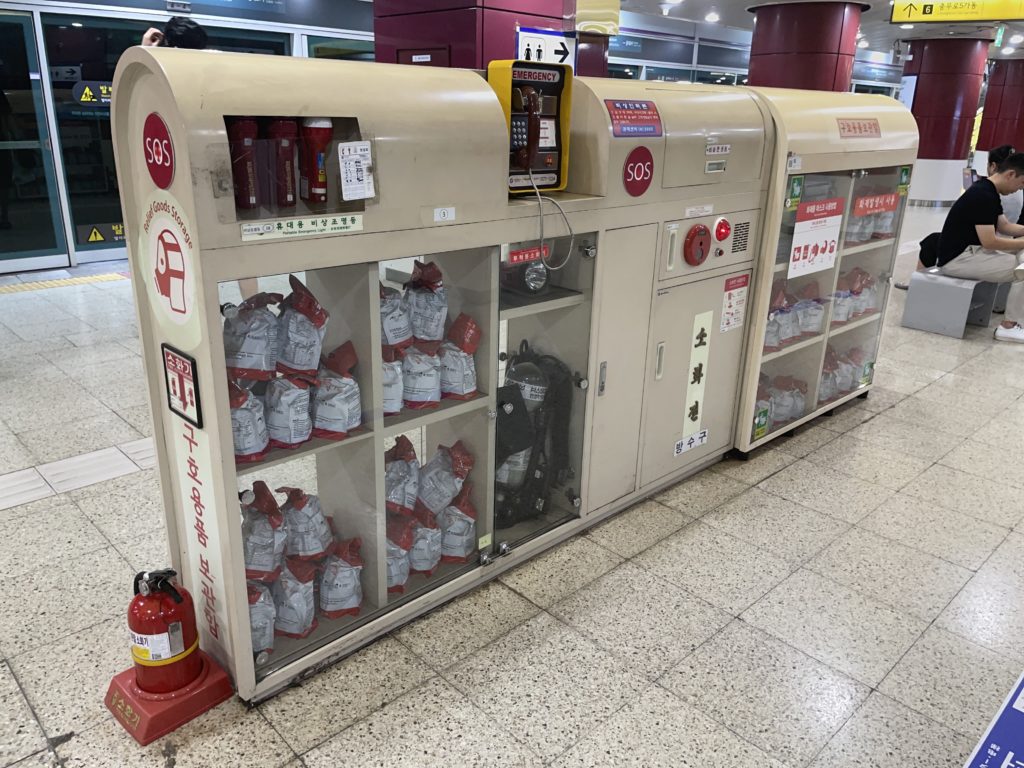 韓国は常に有事の可能性を意識せざるを得ない国であり、その一環として公共交通機関や空港など、多くの人が集まる場所にガスマスクが配備されているのです。