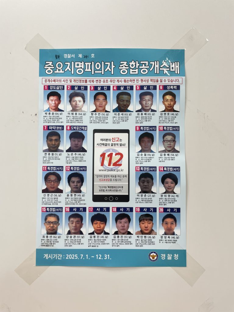 日本でも交番や駅前に「全国指名手配犯」のポスターが貼られているのを見かけますが、韓国でも同じように、警察署や駅、バスターミナル、公共施設の掲示板に指名手配犯の顔写真や情報が掲示されています。