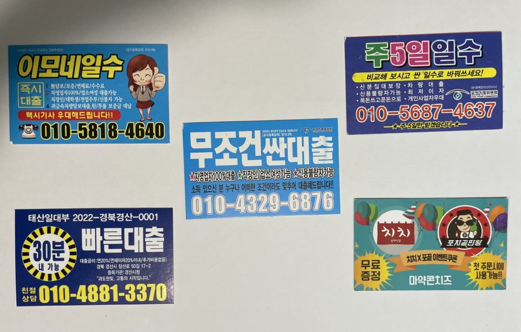 韓国旅行の際に、繁華街を歩いていて「名刺みたいなものがやたら落ちているな」と気づいたら、それはまさに裏社会とつながる「闇金業者の広告」かもしれません。