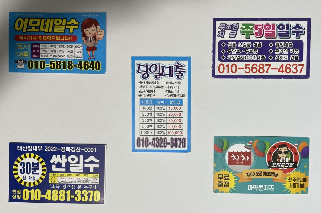 これらは韓国語で「사채(サチェ)」と呼ばれる高利貸し業者の宣伝で、公式な金融機関ではなく、法外な金利で貸付を行う違法業者です。